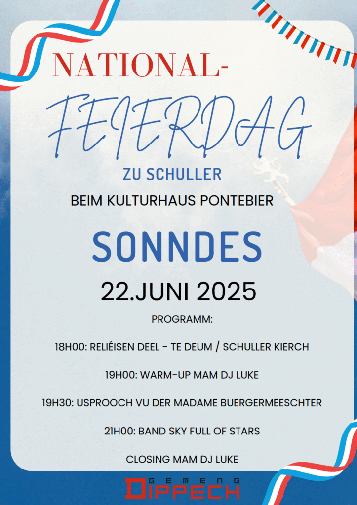 Sonndes, den 22. Juni empfänke mir Iech ab 18 Auer bei eisem Kulturhaus Pontebier fir d’Festivitéiten um Virowend vu Nationalfeierdag zu Schuller:
