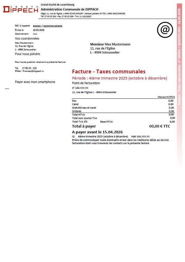Sollt Dir är Facture vun de Gemengentaxe vum 4. Trimester 2025 net kritt hunn, kënnt Dir Iech elo eng Kopie per Email ufroen: finances@dippach.lu